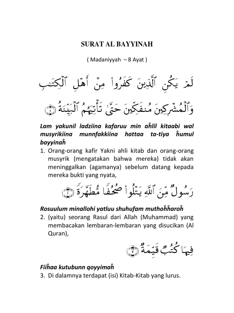 2:21 khobarorid 75 590 просмотров. It's wonderful to share with you all i like as a muslimah and i want you to be always positive. Lam yakunil ladziina kafaruu min ahlil kitaabi wal musyrikiina mungfakkiina hattaa ta'tiyahumul bayyinah. Baca surat al bayyinah lengkap bacaan arab, latin & terjemah indonesia. English translation, (according to google translate), of the latin phrase.