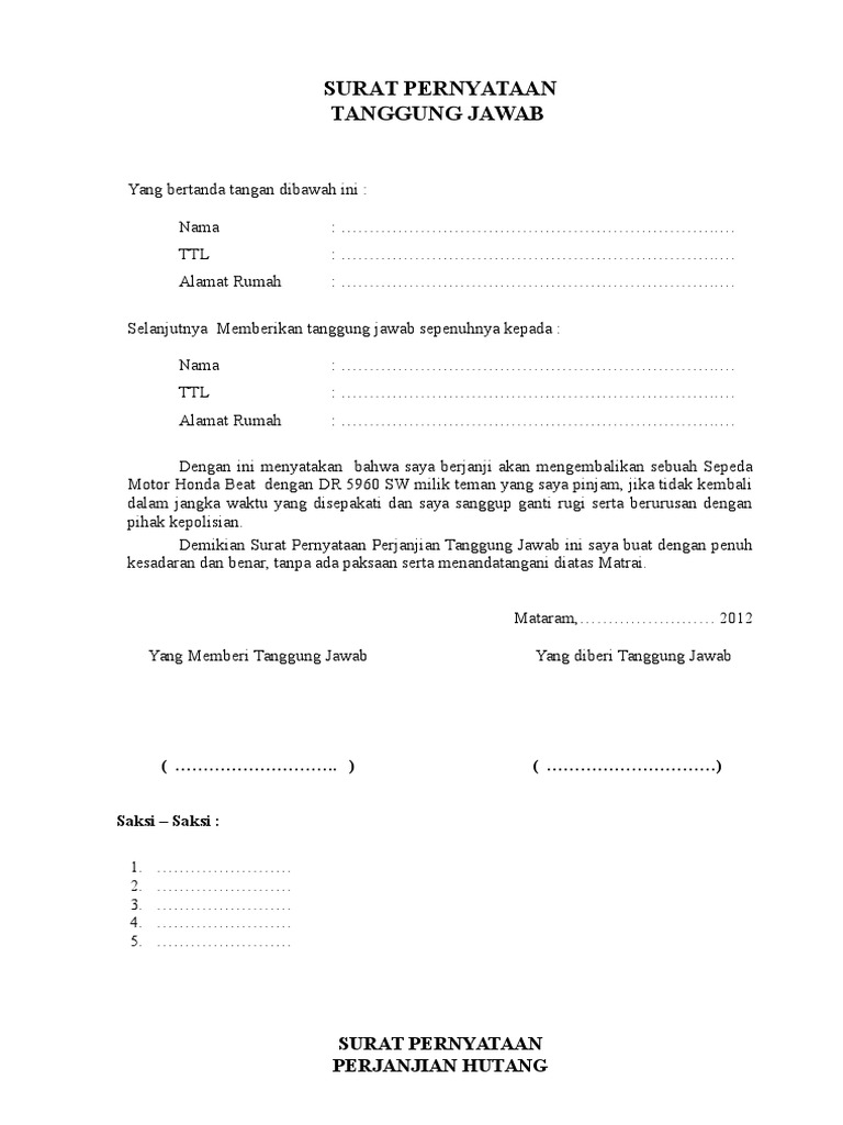 Menyatakan bersedia bertanggung jawab untuk menerima block grant contoh surat perjanjian tentang persiapan sebelum sbmptn ini hanya salah satu kasus dari sekian banyak. Berikut adalah beberapa contoh surat perjanjian hutang yang dapat kalian jadikan contoh apabila ingin memberi hutang atau justru menjadi pihak yang ingin berhutang pasal 3 : Surat pertanggungjawaban biasanya dibuat untuk menyatakan tanggung jawab pimpinan terhadap sesuatu yang berlangsung pada instansi yang dipimpinnya. Maka, sejak tanggal 8 juni 2018, tanah bangunan tersebut telah menjadi hak milik pihak kedua. Bagi pembuat, surat pernyataan ini merupakan tanggung jawab dan janji yang harus ditepati. Kami yang bertandatangan di bawah ini: Surat pernyataan tanggung jawab mutlak. Menyajikan contoh surat pernyataan kerja, contoh surat pernyataan diri, contoh surat masa kerja : Tutup surat perjanjian anda dengan pernyataan bahwa surat perjanjian tersebut telah disetujui oleh kedua pihak tanpa paksaan dari pihak manapun. Contoh surat bisnis, surat dinas, surat izin, surat kuasa, surat lamaran kerja, surat pemberitahuan, surat penawaran, surat pengunduran diri, surat peringatan, surat perjanjian, surat pernyataan, surat resmi pada hari ini senin tanggal satu februari tahun dua ribu enam belas. Kami yang bertanda tangan di bawah ini untuk material yang diperlukan adalah tanggung jawab dari pihak kedua akan tetapi dengan persetujuan. Pictures gallery of contoh surat pernyataan tanggung jawab. Hal ini karena mengingat bahwa orang yang awam sekalipun mayoritas pernah membuatnya untuk keperluan tertentu.